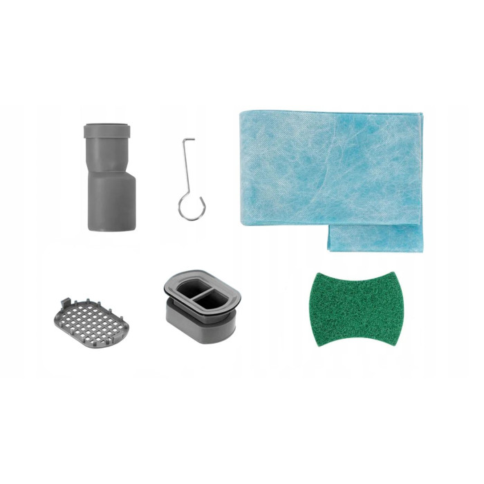Комплектация регулируемые ножки, сифон, манжет Dry-Fix, фильтр-корзина, инструкция по эксплуатации, губка, крючок